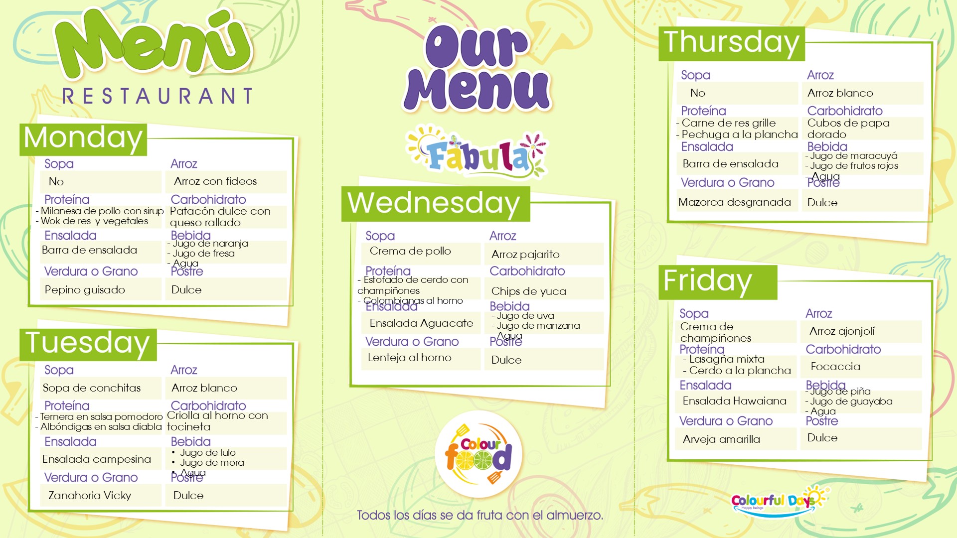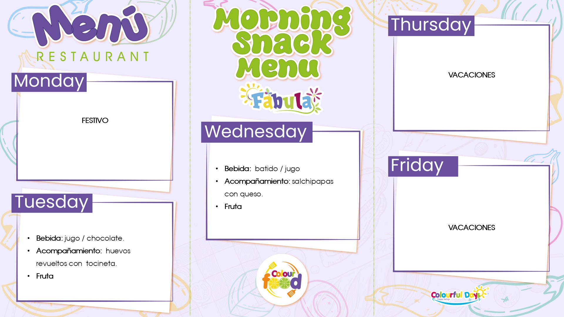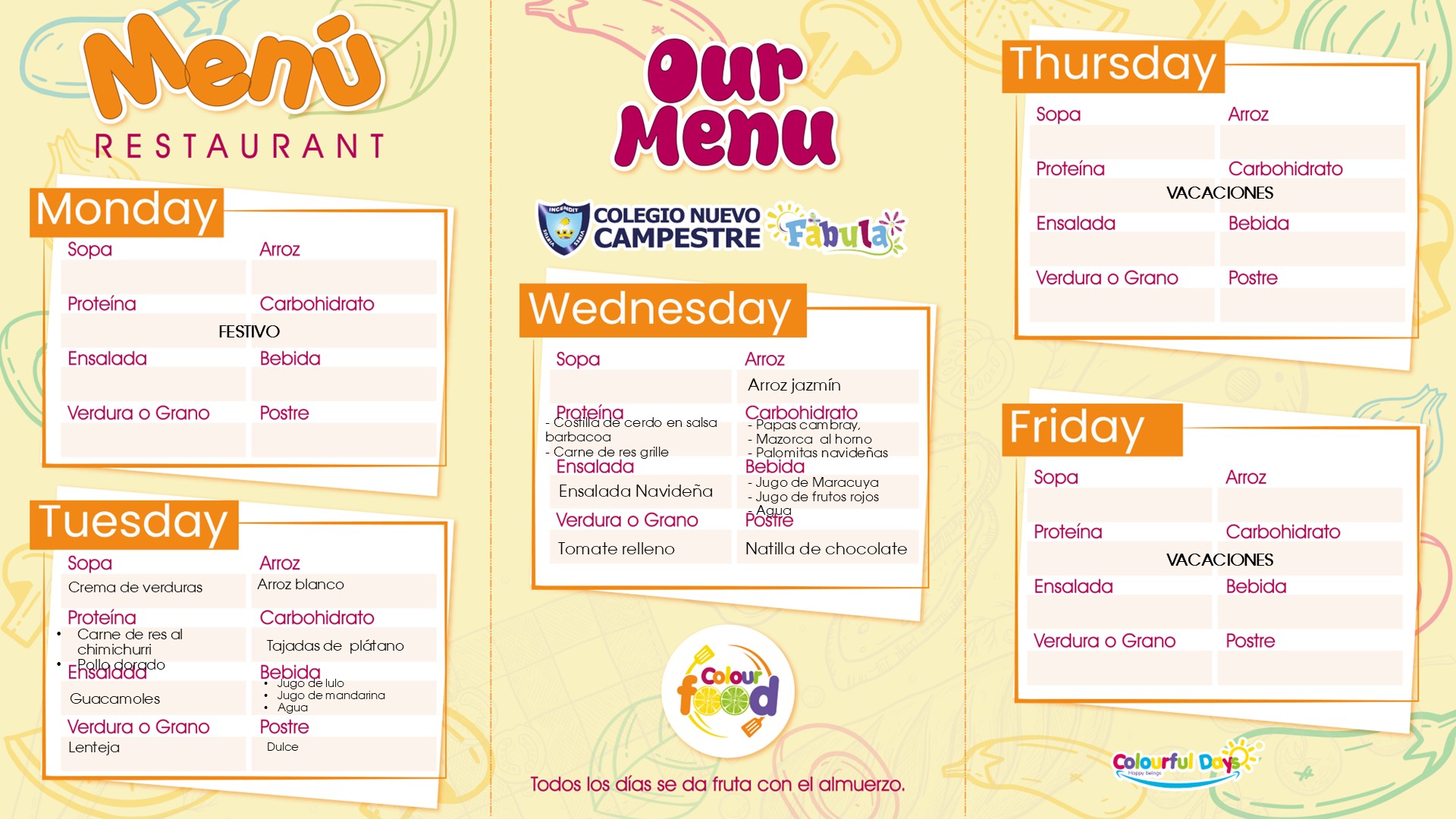 - Nuestros niños tienen tres horarios para tomar sus alimentos: Medias Nueves: 9:30 Almuerzo: 12:30. Onces: 3:15